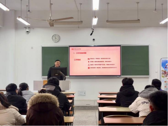 招聘会上,HR朱永东多维度解读车险行业前景,并介绍了招聘岗位的工作流程和任职要求,强调岗位具有移动办公、节奏快、交互强、技术含量高等特点。此外,介绍了公司“双通道晋升+多元化培训”的人才发展体系,以及薪酬福利、后勤与装备支持等,让同学们全面了解岗位发展与待遇。会议最后设置了答疑交流环节,同学们围绕岗位要求、招聘流程等问题积极提问,HR逐一进行解答,现场互动氛围热烈。